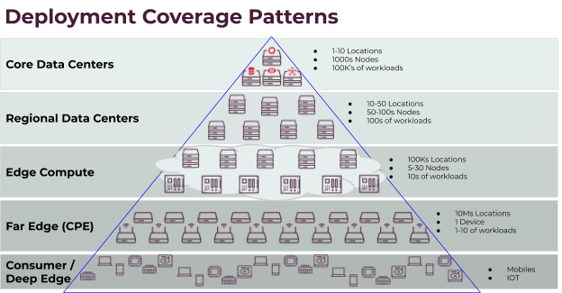 From there we move down the line to edge compute locations; these locations are still clouds, consisting of a few to a few dozen nodes and hosting a few dozen workloads, and existing in potentially hundreds of thousands of locations, such as cell towers or branch offices.