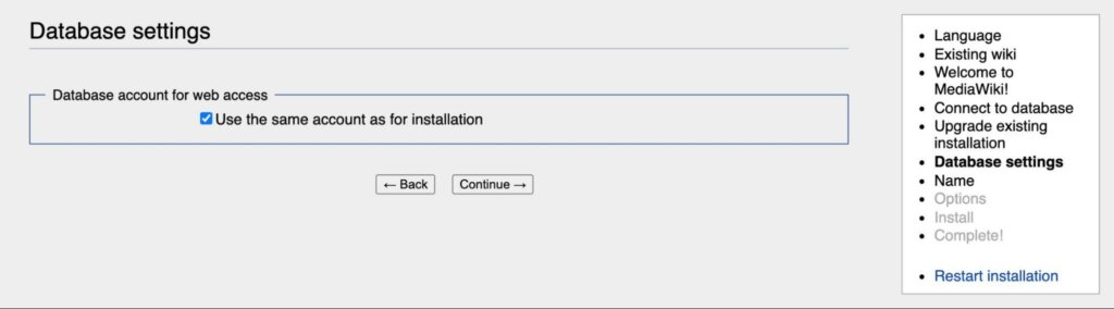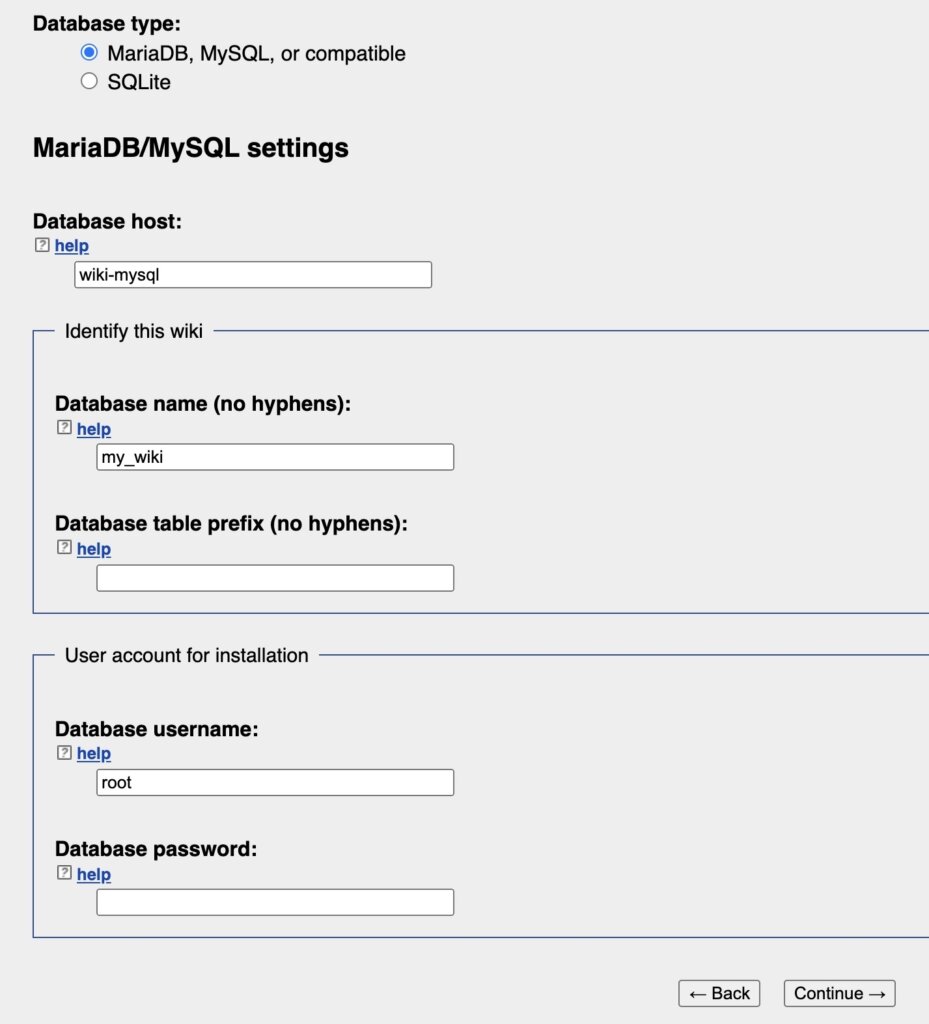 For Database host, you can simply enter the name of the database container—in this case, wiki-mysql. If these containers are restarted, they’ll still be able to interact with one another as configured, even if those future instances have different IP addresses.