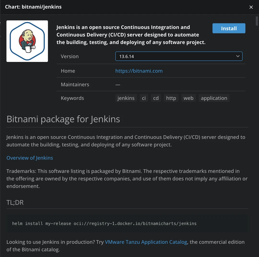 We can see what the chart is all about, and we even have an option to install it, so let’s click on Install. In the terminal, an editor will open to edit the values of the chart. After you are ok with the edits, you can click on the Save icon in the left corner, and then you will see that the chart was installed successfully: