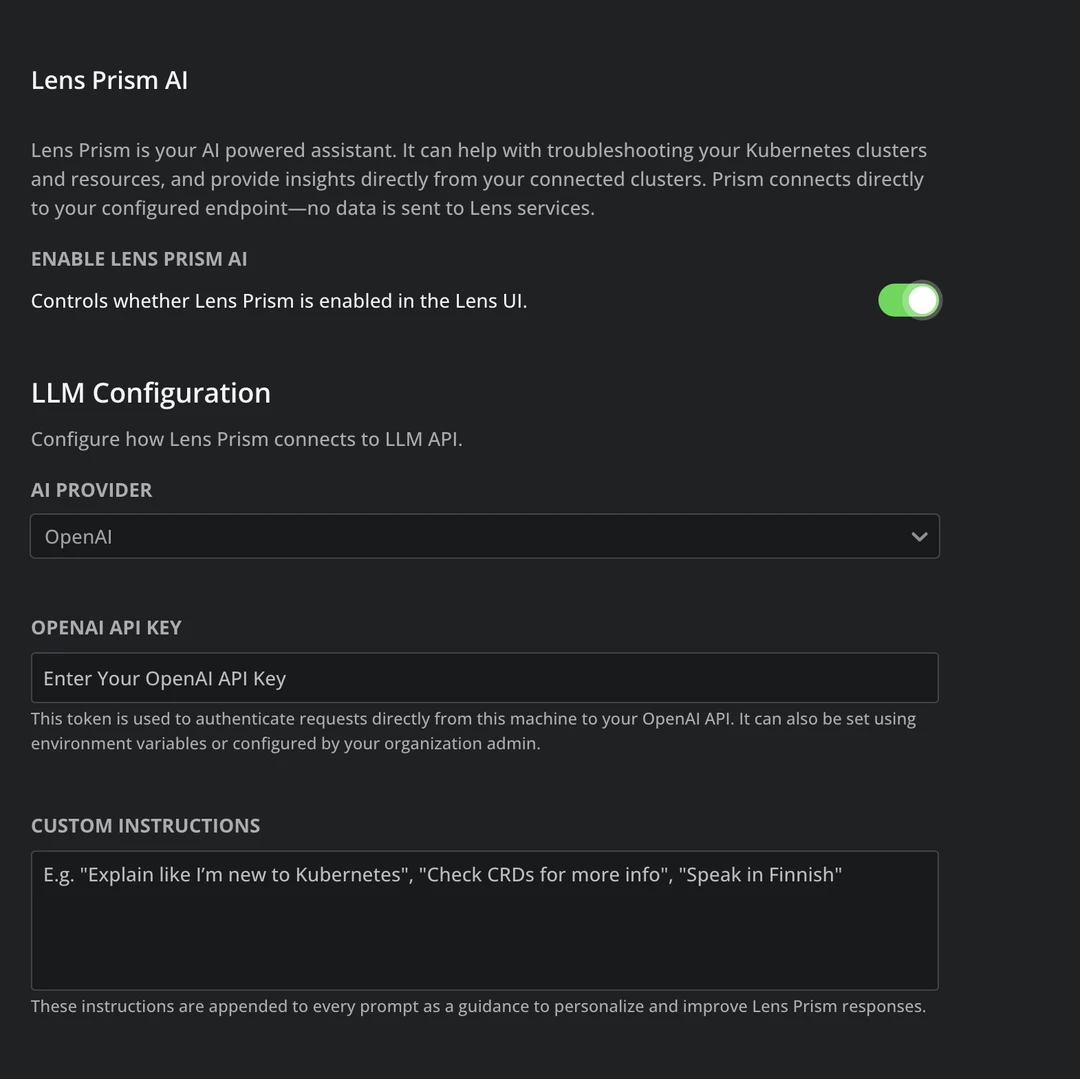 You will need to enable Lens Prism, and then select your AI Provider, and add your API key: