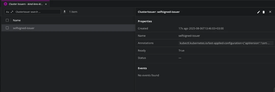 I’ve created a dummy cluster issuer, and as soon as I’ve created it, we can see it in Lens K8S IDE: