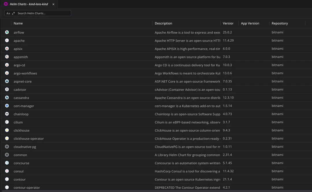After running these commands, if we go to our K8s cluster, under Helm and select Charts, we will see all the available Helm charts.