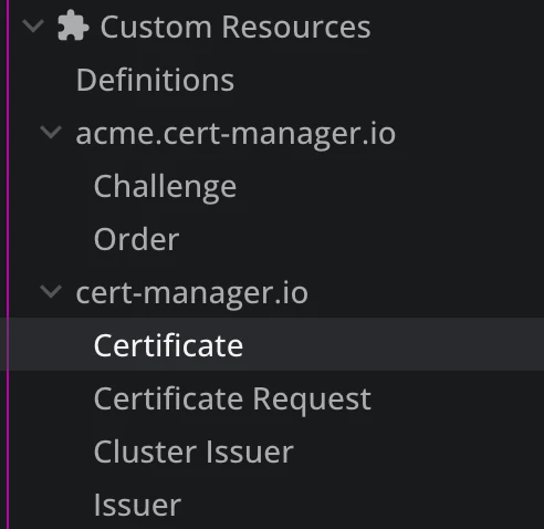 In Lens K8S IDE, if we navigate to Custom Resources, we will see that two new definitions have been added: