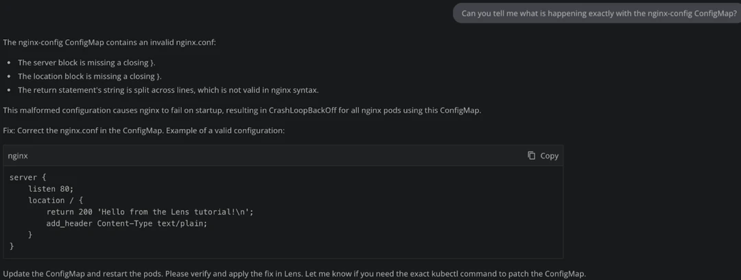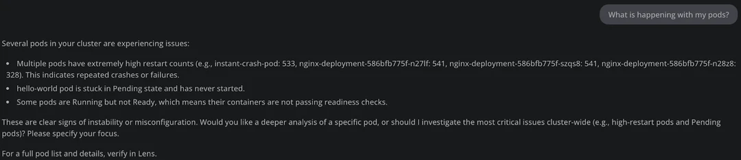 Lens Prism is an AI-Powered Kubernetes Copilot accessible directly from Lens K8s IDE. It connects to OpenAI compatible LLM and it can help you understand what is happening inside of your Kubernetes clusters, making the debugging process easier.