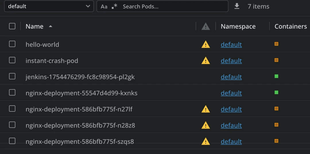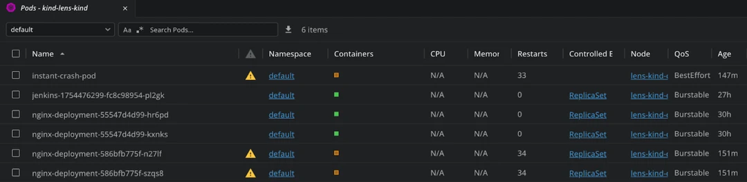 In Lens K8s IDE, you can see at a glance what are the pods that have issues by checking for the yellow triangle in the Pods view.