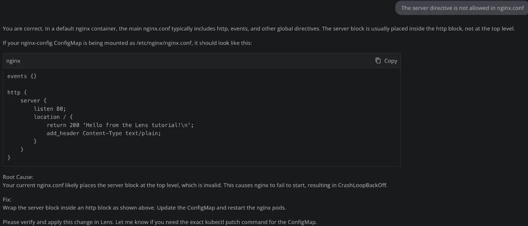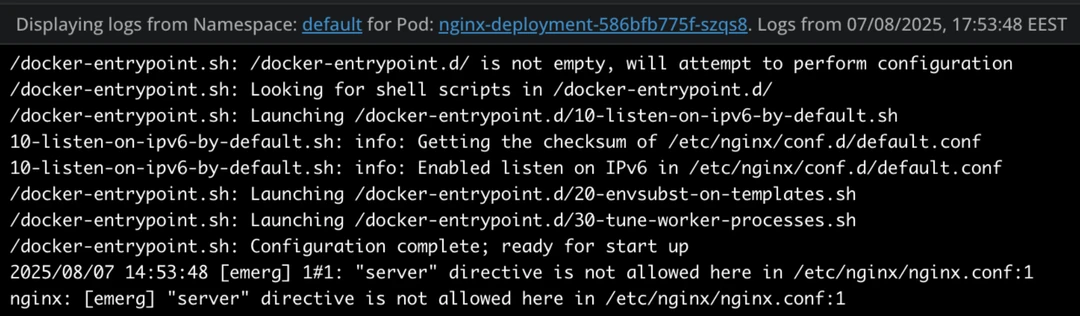 So it’s clear that our ConfigMap has some issues, let’s fix them as Lens Prism told us and see what is happening. After applying the fix, we are still facing errors because the server directive doesn’t exist on its own in nginx.conf.