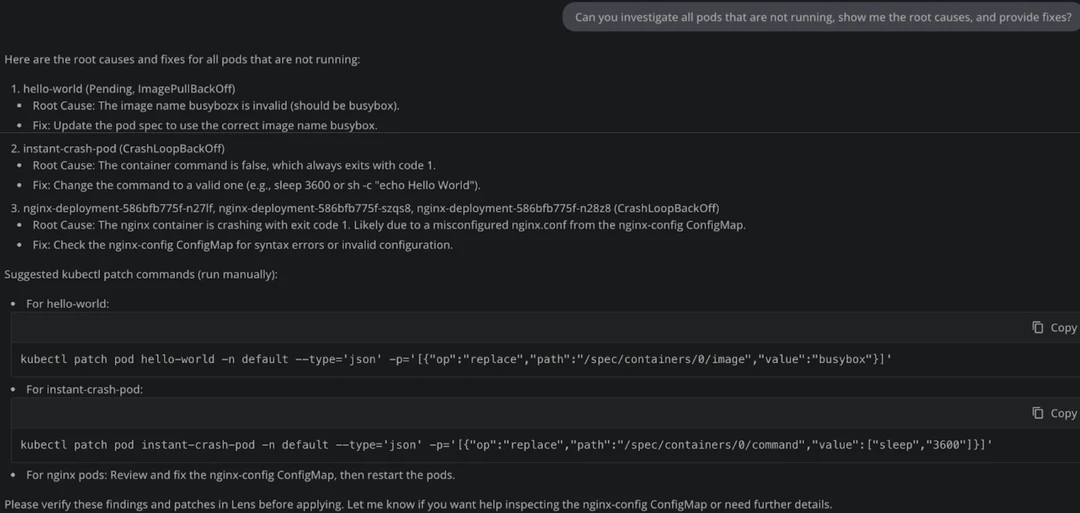 Lens Prism sped up our debugging time considerably, and using at scale will help us solve many issues our Kubernetes resources will face. Because it is integrating with LLMs, you should always be mindful that fixes it provides may not always work on the first try, and that’s to be expected.