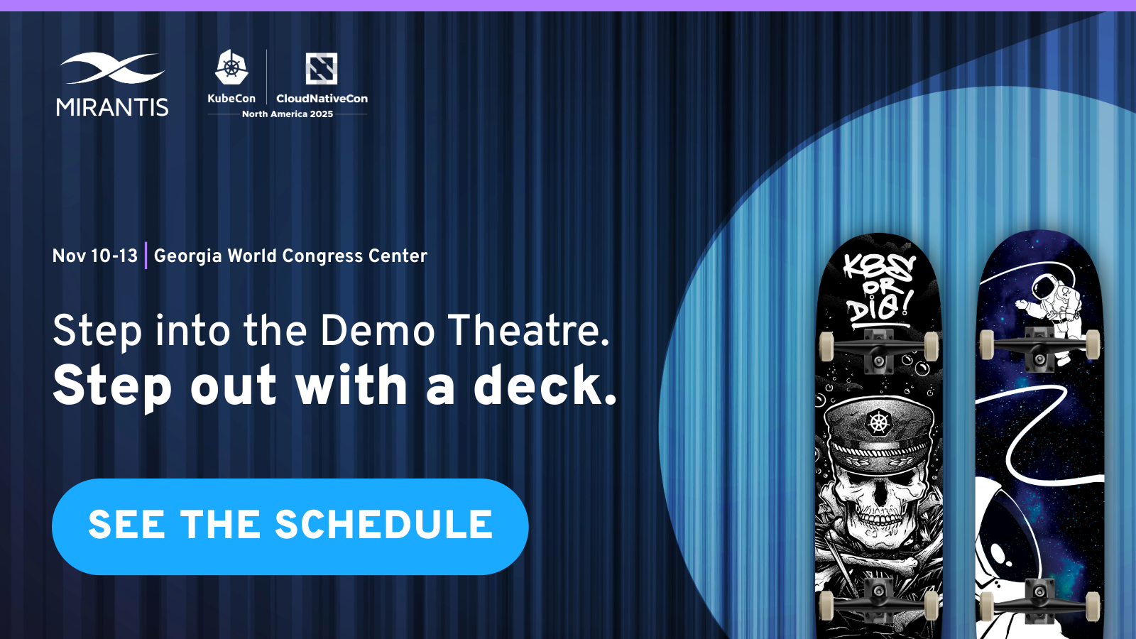 Join us in Atlanta from November 11–13 to see how Mirantis streamlines multi-cluster Kubernetes and unleashes AI infrastructure at scale. Mirantis is doing a skateboard raffle after each demo session, so make sure you are joining the demos according to schedule.