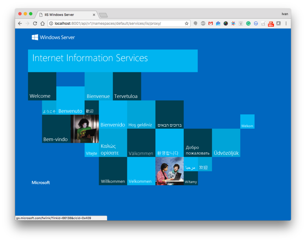 $ kubectl proxy Starting to serve on 127.0.0.1:8001And navigate to http://localhost:8001/api/v1/namespaces/default/services/iis/proxy/ to access the cluster service. Voila! We've made a service that points at IIS.