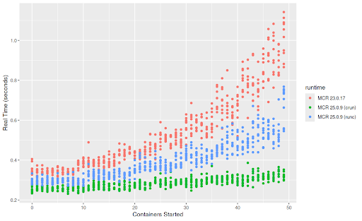 However, crun has a smaller binary size, requires less memory, and offers performance advantages, as we confirmed by testing older and newer versions of MCR.