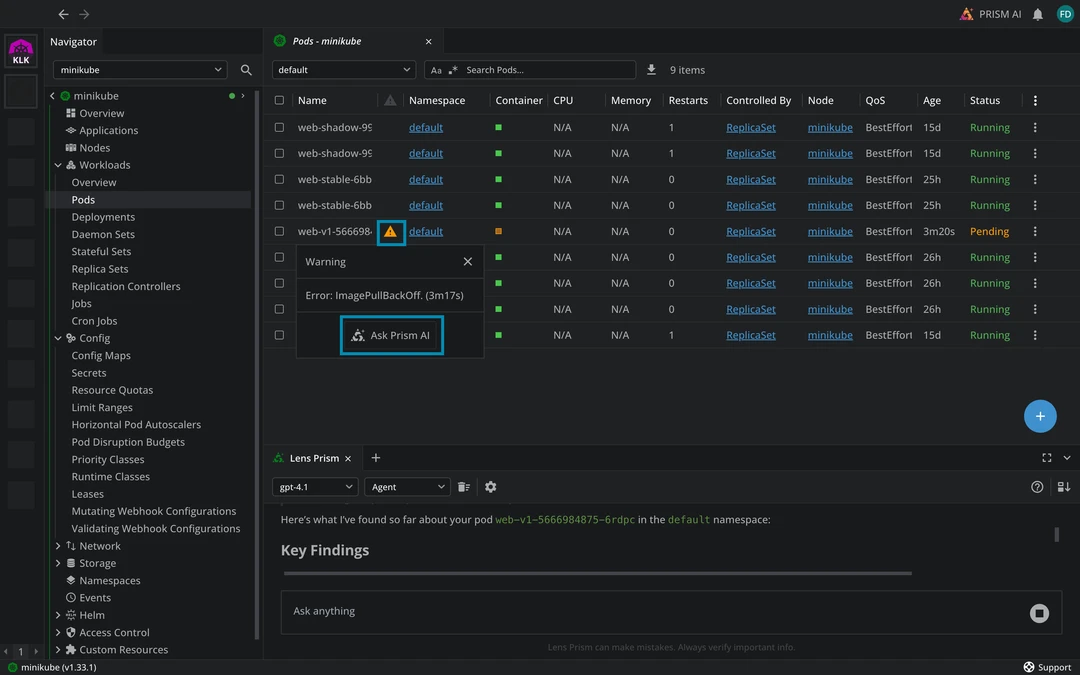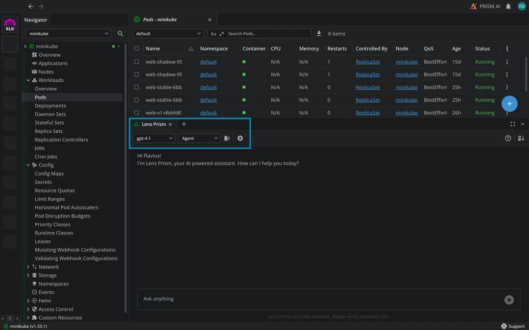 We’ve transformed how you work with Lens Prism, making it more contextually aware and accessible throughout your Kubernetes workflow. The biggest star of this release is that you can now run Prism in Agent mode.