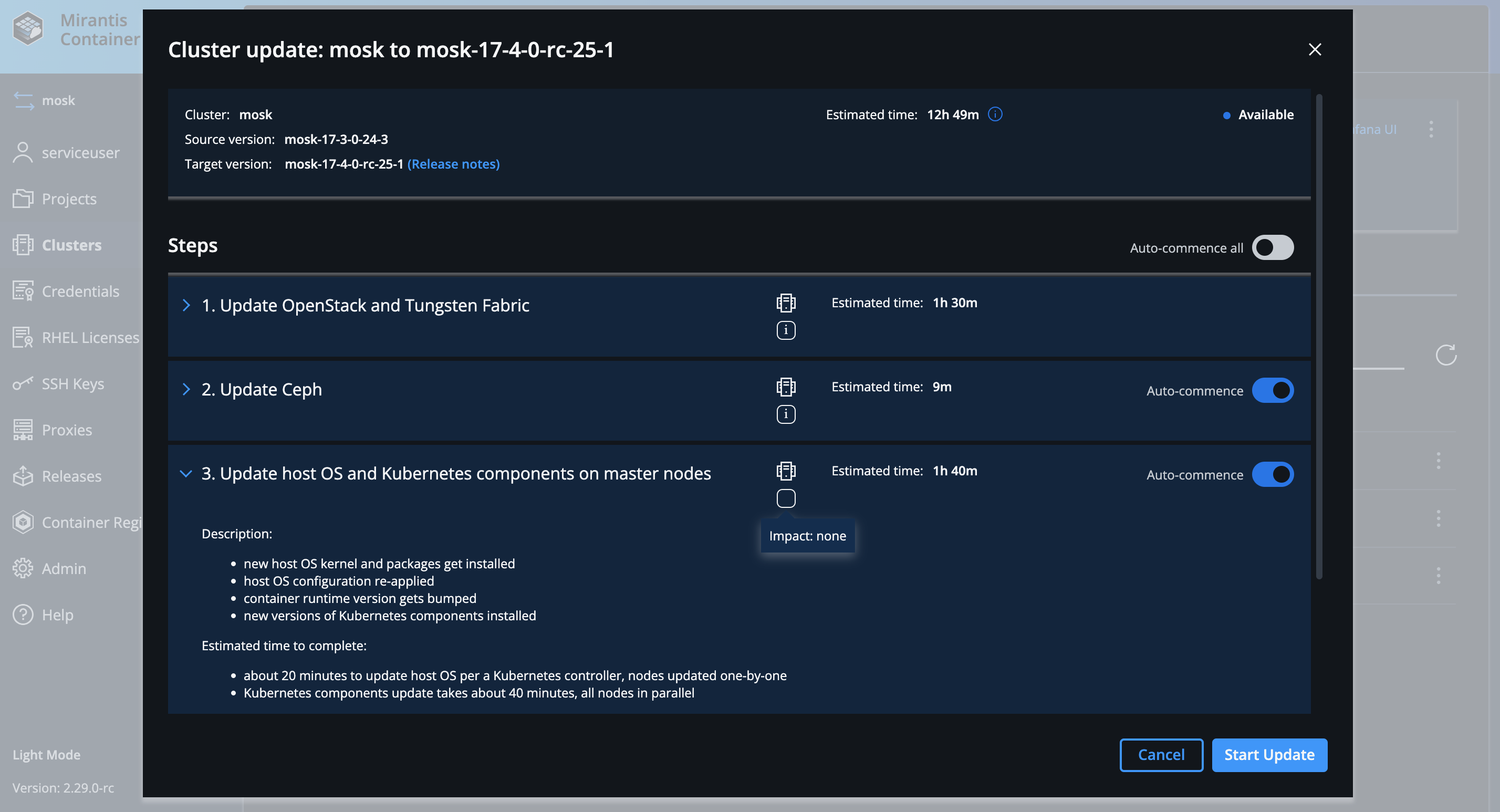 The ClusterUpdatePlan API now also features automated impact and duration estimation, reducing the need for manual assessments. By dynamically analyzing the specific MOSK cluster architecture and target release data, this functionality provides operators with a forecast of update times and potential disruptions, helping them better plan and minimize downtime.