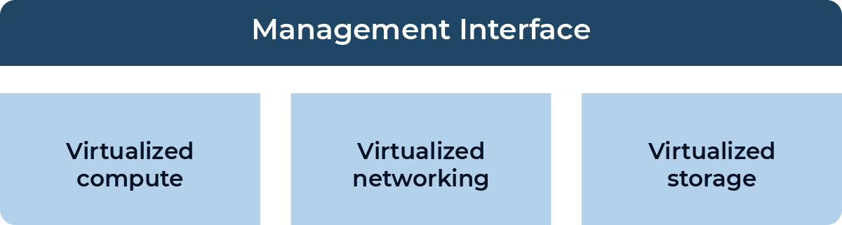 Management layer: Provides a single interface for provisioning, monitoring, and automating tasks across all virtual resources, preventing teams from needing to deal with individual proprietary hardware controls.