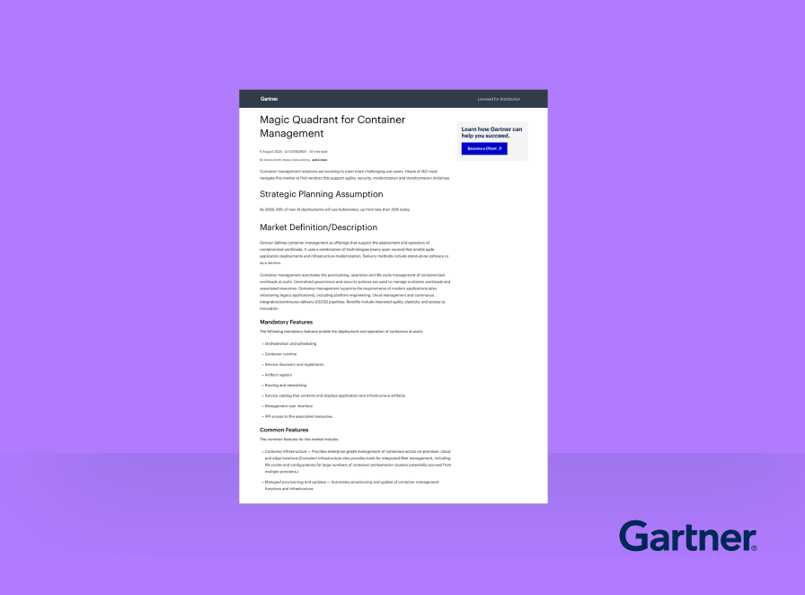 Gartner, Magic Quadrant for Container Management, August 6 2025 by Dennis Smith, Wataru Katsurashima, Tony Lams, Lucas Albuquerque, michael Warrilow, and Stephane Bauman. GARTNER is a registered trademark and service mark of Gartner,inc and/or its affiliates in the U.S. and internationally, Magic Quadrant is a registered trademark of Gartner, Inc. and/or its affiliates and is used herein with permission all rights reserved.