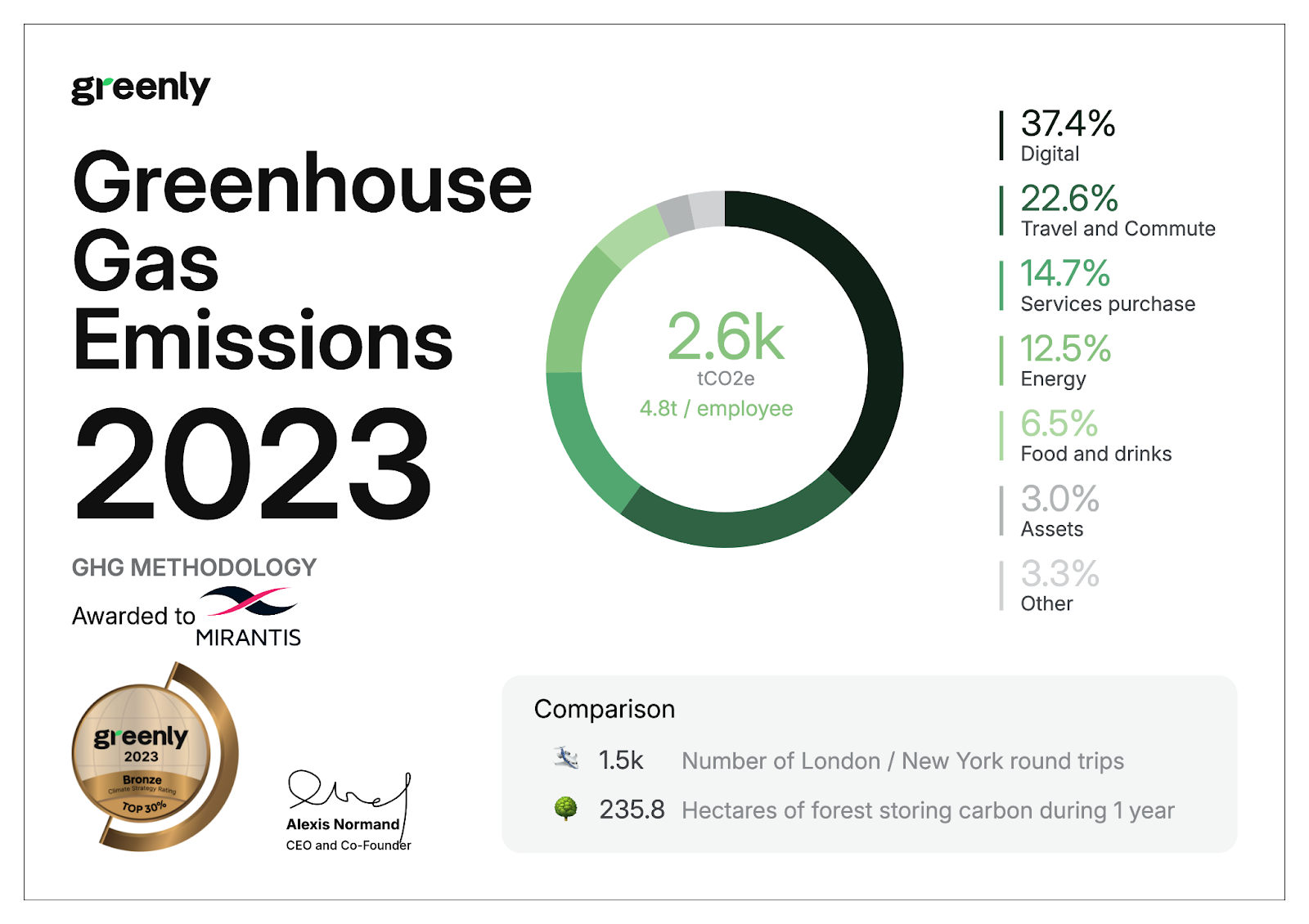 Mirantis has been committed to environmental responsibility for years, and we are proud to share the results of our first carbon emissions measurement and reduction plan. Last year we began working with Greenly, a platform that helps organizations measure and reduce their carbon footprint by analyzing various operational activities and data-driven insights. In our recently completed Greenhouse Gas (GHG) Emissions Report, Mirantis received impressive results for different categories of greenhouse gas emissions, well below industry averages, earning us a Bronze medal, and ranking us in the top 30% of companies assessed for climate strategy.