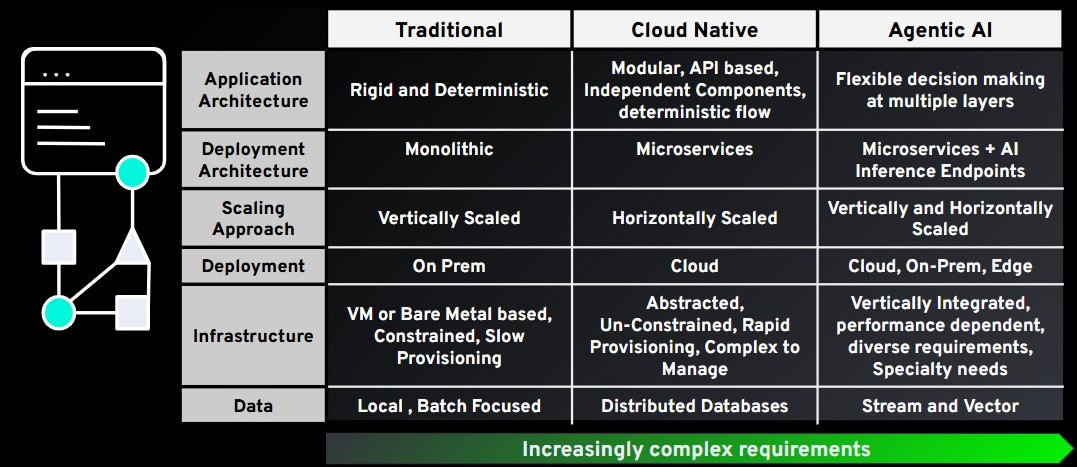 AI is reshaping the architecture of applications. Traditional, modular, and cloud-native approaches are being superseded by agentic AI patterns, which introduce flexible decision-making at multiple layers and increase resource demands across cloud, on-prem, and edge. At the same time, workloads are no longer abstracted from infrastructure. The performance and behavior of AI applications are now closely tied to the capabilities of the underlying stack, marking a fundamental change from past architectural approaches.