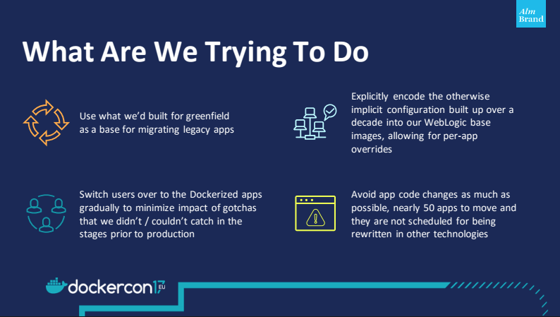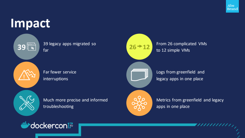 Today, Alm. Brand has migrated 39 WebLogic applications to their Docker Enterprise environment to go along with almost 50 new greenfield apps. They were able to execute the migrations with minimal disruption by load balancing applications between the legacy cluster and the new Docker cluster, gradually transitioning traffic from one cluster to the other without disrupting users. Sune and Loke demonstrated this process in their talk and it’s worth checking out!