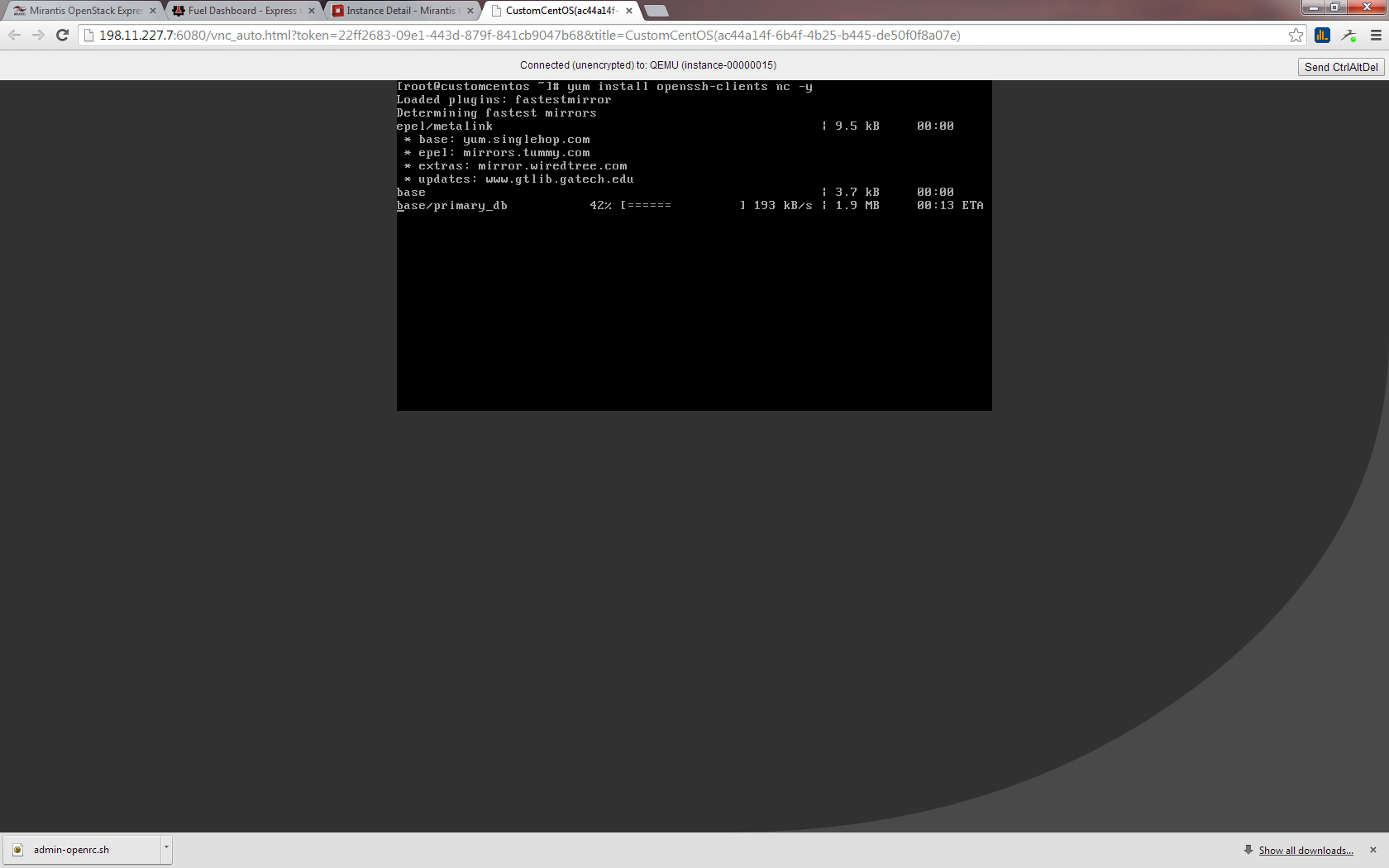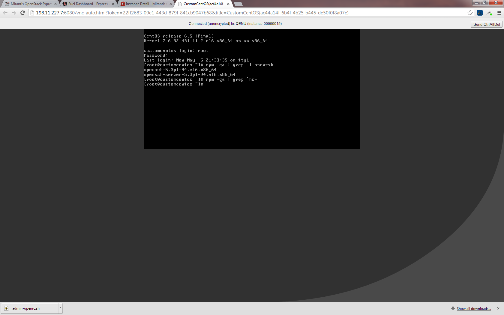In this case, we'll walk through the process of customizing the image we uploaded in the Upload an Image to OpenStack section. Launch an instance of that image onto net04, open a console to it and login with the root credentials. Here we are going to look for the openssh-clients package, which we need to scp files to/from the VM. We'll also check for nc (netcat), which is a very useful tool for testing ACL rules (Security Groups).