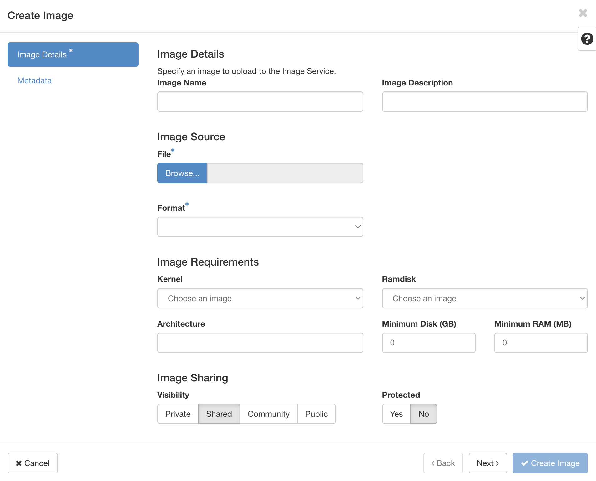 Upload the image file to the controller node: Use a tool such as SCP to upload the image file to the controller node.