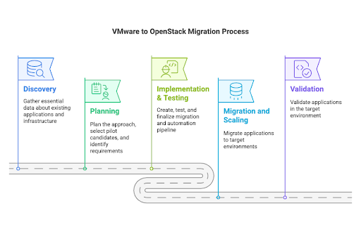 Before workload migration can begin, the OpenStack environments need to be prepared for application onboarding. This typically involves architecture design, pilot deployment and validation, and staff training. According to best practices, VMware to OpenStack migration includes five primary phases: Discovery, Planning, Implementation & Testing, Migration, and Validation.